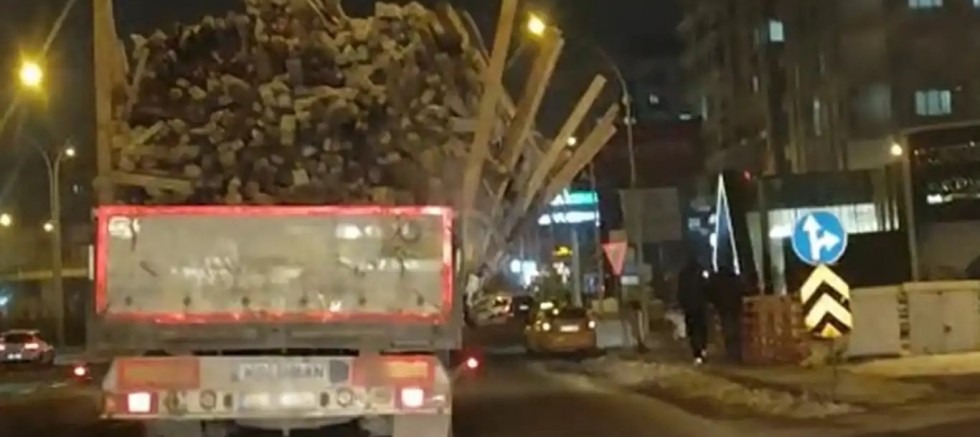 Çevredeki vatandaşların cep telefonu kameralarıyla kaydettiği görüntülerde, kamyon kasasına kapasitesinin çok üzerinde yüklenen odun ve ahşap parçalarının güvenli şekilde sabitlenmediği görüldü. Kasadan dışarı taşan ve yanlara doğru uzanan uzun ahşap parçaları, yoldaki diğer sürücüler için büyük risk oluşturdu.