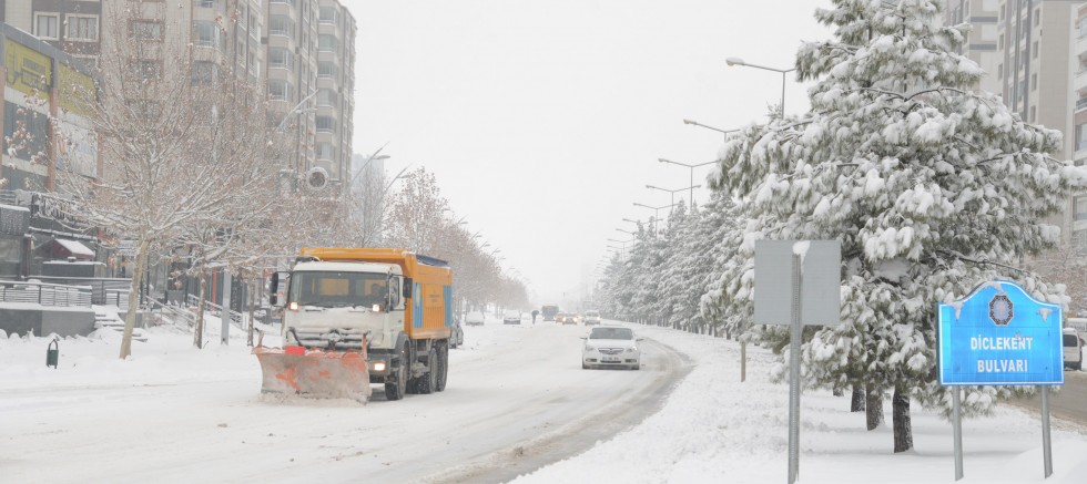Diyarbakır’da dün akşam saatlerinde başlayan kar yağışı, gece boyunca etkisini sürdürerek kent merkezini beyaza bürüdü. Kar kalınlığı kent merkezinde 25 santimetreyi aşarken, Büyükşehir Belediyesi öncülüğünde oluşturulan Karla Mücadele Koordinasyonu kapsamında; Yol Yapım Bakım ve Onarım Dairesi Başkanlığı, Çevre Koruma ve Kontrol Dairesi Başkanlığı, Park ve Bahçeler Dairesi Başkanlığı, Sağlık İşleri Dairesi Başkanlığı ile Diyarbakır Su ve Kanalizasyon İdaresi (DİSKİ) Genel Müdürlüğü ile Sur, Kayapınar, Bağlar ve Yenişehir belediyelerinden bin 288 personel, dün akşam ekipmanlarıyla çıktıkları sahada karla mücadele çalışmalarını aralıksız sürdürdü.
