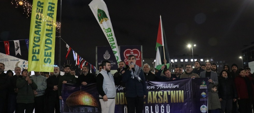 Bağcılar Meydanı'nda Ercan Bozkurt'un Kur'an-ı Kerim tilaveti ile başlayan programda konuşan HÜDA PAR İstanbul İl Başkanı Mehmet Eşin, Kudüs'ün yalnızca bir şehir değil Müslümanların ilk kıblesi, Hazreti Ömer'in emaneti, Selahaddin Eyyubi'nin ikinci kez fethettiği kutsal bir mekân olduğunu ifade etti.